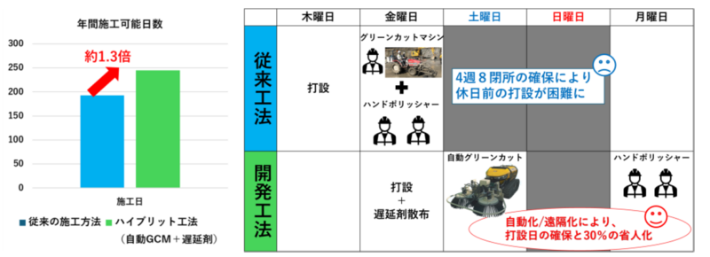 • 【工程の制約】:コンクリートが固まりきる前に処理を行う必要があるため、打設翌日の作業が必須。土曜日に打設すると日曜日に出勤しなければならず、週休2日制の大きな妨げになっていた。